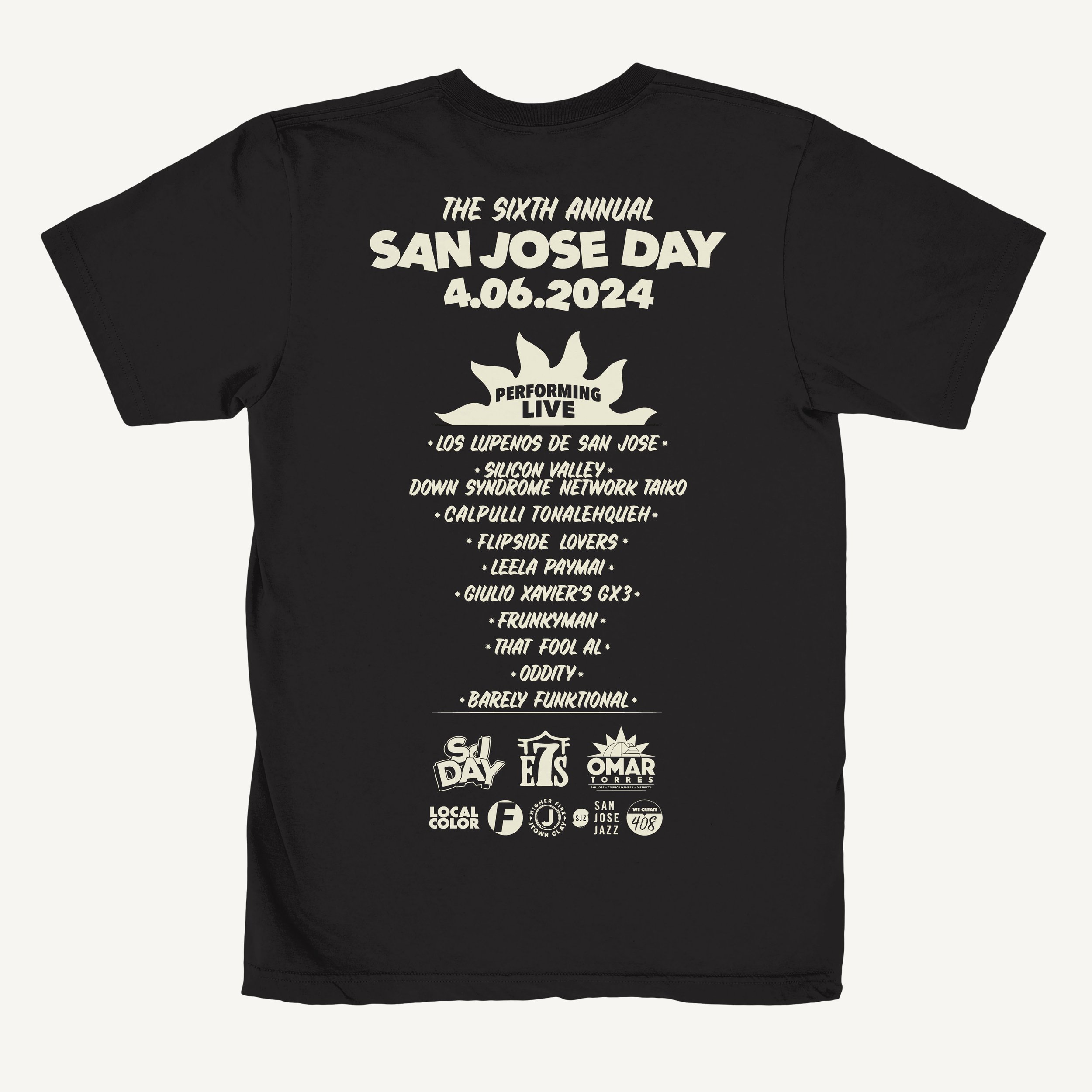 SHOP › Black 6th Annual San José Day Tee Image 1 of 3 Image 2 of 3 Image 3 of 3 Black 6th Annual San José Day Tee Sale Price: $5.00 Original Price: $32.00 All Sales are FinalTee: Unisex Bella Canvas, 100% CottonInk: Cream Discharge Color: Select Color Black Size: Select Size XS SM Add To Cart Added! All Sales are FinalTee: Unisex Bella Canvas, 100% CottonInk: Cream Discharge